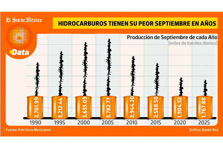 Encuentre la nota en: https://oem.com.mx/elsoldemexico/finanzas/data-produccion-de-hidrocarburos-tiene-su-peor-septiembre-en-35-anos-26752572