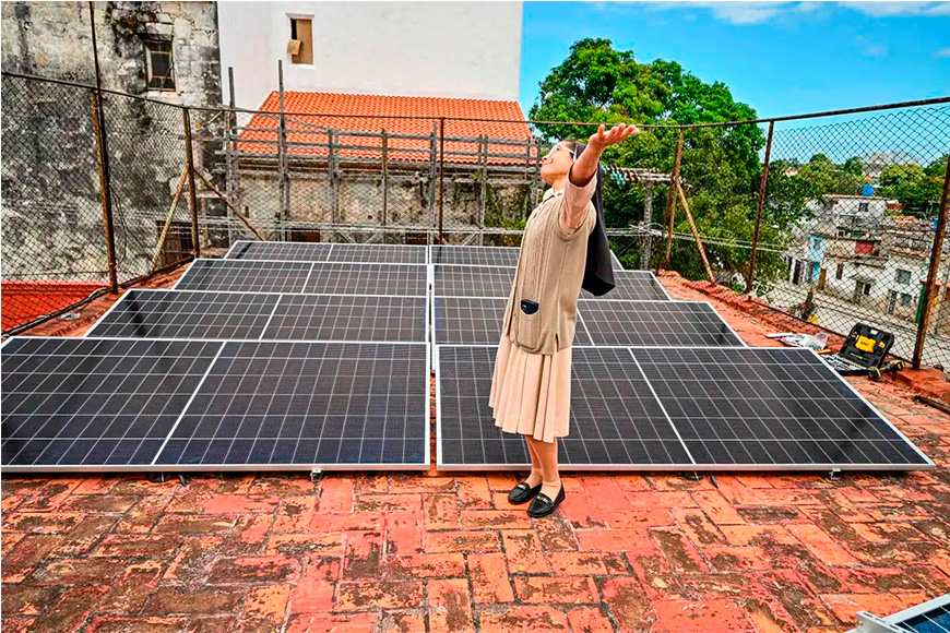 En el barrio de Guanabacoa, en el este de La Habana, los obreros se afanan en instalar 12 paneles solares en el techo de un hogar para ancianos gestionado por la Iglesia católica. Con estos aparatos, las religiosas podrán preparar alimentos para unas 80 personas.