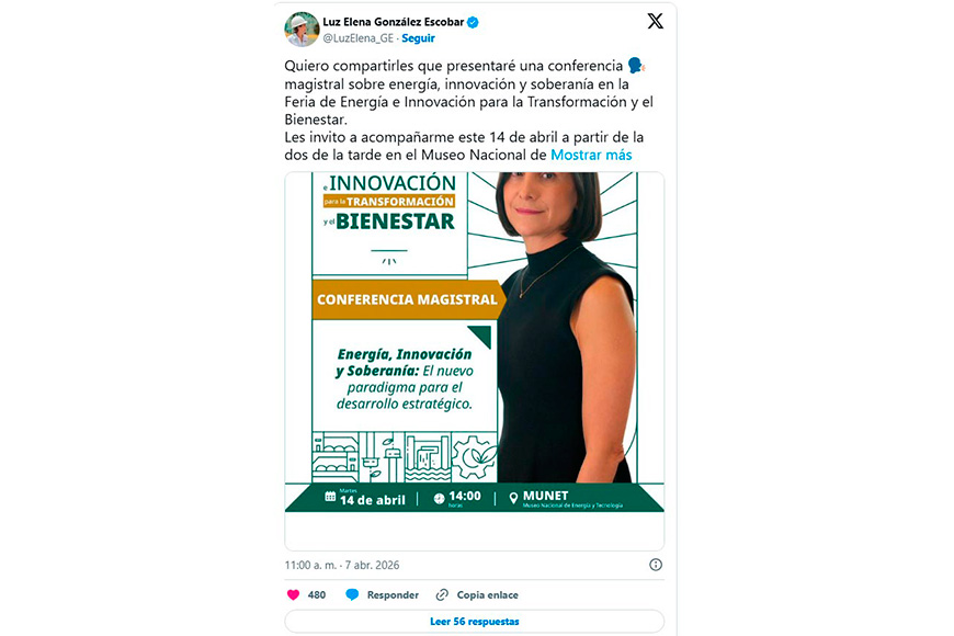 El evento será inaugurado por Luz Elena González Escobar, quien encabezará una conferencia magistral en la que abordará los retos y oportunidades de la transición energética en el país.