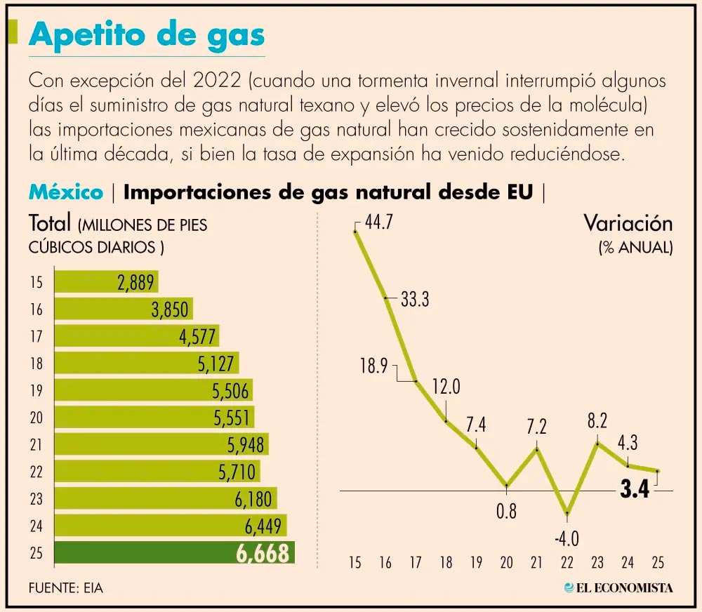 Las importaciones mexicanas de gas natural desde Estados Unidos cerraron el 2025 en un volumen récord de 6,668 millones de pies cúbicos por día, incrementándose 3.4% en un año, en el que se añadieron 219 millones de pies cúbicos diarios a estas compras que reflejan la creciente dependencia del país a las dinámicas de este insumo en el vecino del Norte.
