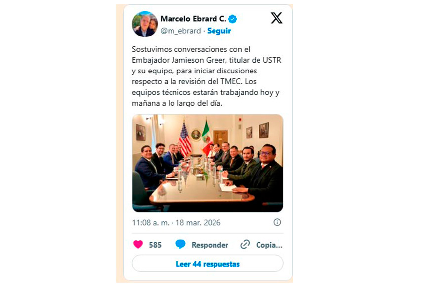 “Sostuvimos conversaciones con el Embajador Jamieson Greer, titular de USTR y su equipo, para iniciar discusiones respecto a la revisión del T-MEC. Los equipos técnicos estarán trabajando hoy y mañana a lo largo del día”, informó esta mañana el secretario Marcelo Ebrard a través de sus redes sociales.