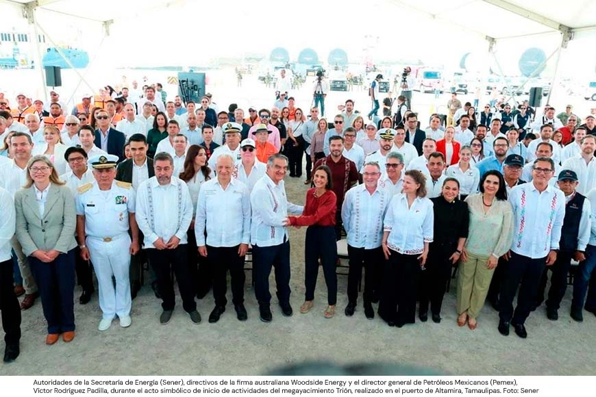 En una ceremonia realizada en el Patio de Puertos Integrales del Sureste, ubicado en el puerto de Altamira, Luz Elena González Escobar, titular de la Secretaría de Energía (Sener), directivos de Woodside y el director general de Petróleos Mexicanos (Pemex), Víctor Rodríguez Padilla, dieron el “banderazo” para comenzar los trabajos formales en este yacimiento que se encuentra a más de 2 mil 550 metros de profundidad y a 180 kilómetros al este de la costa mexicana.