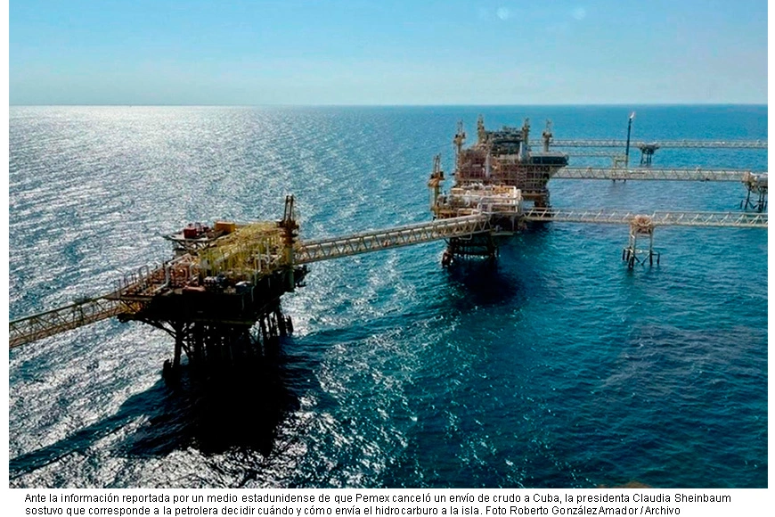 Ciudad de México. Ante la información reportada por el medio estadunidense Bloomberg, de que Petróleos Mexicanos (Pemex) canceló un envío de crudo a Cuba, la presidenta Claudia Sheinbaum Pardo sostuvo que corresponde a la petrolera decidir cuándo y cómo envía el hidrocarburo a la isla.