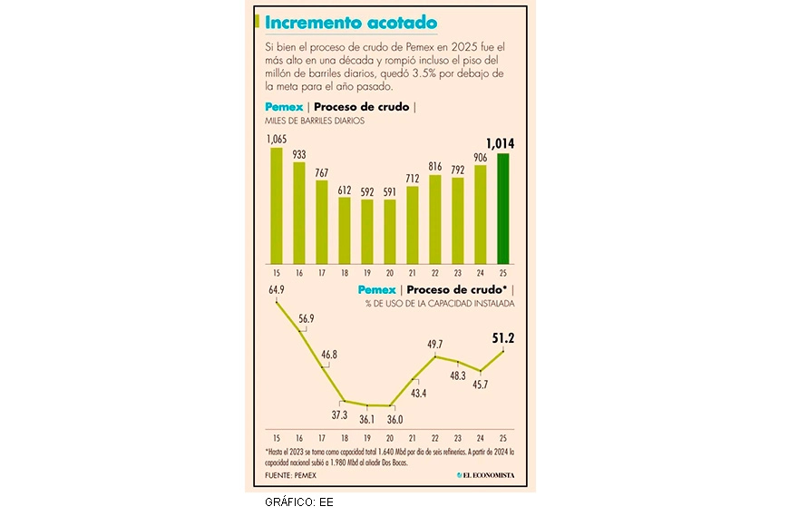 El Sistema Nacional de Refinación compuesto de siete plantas operadas por Petróleos Mexicanos (Pemex) procesó durante el 2025 un promedio de 1.014 millones de barriles diarios de crudo, lo que significó un uso de 51% de su capacidad, mayor a la utilización de 46% que registró el año previo.