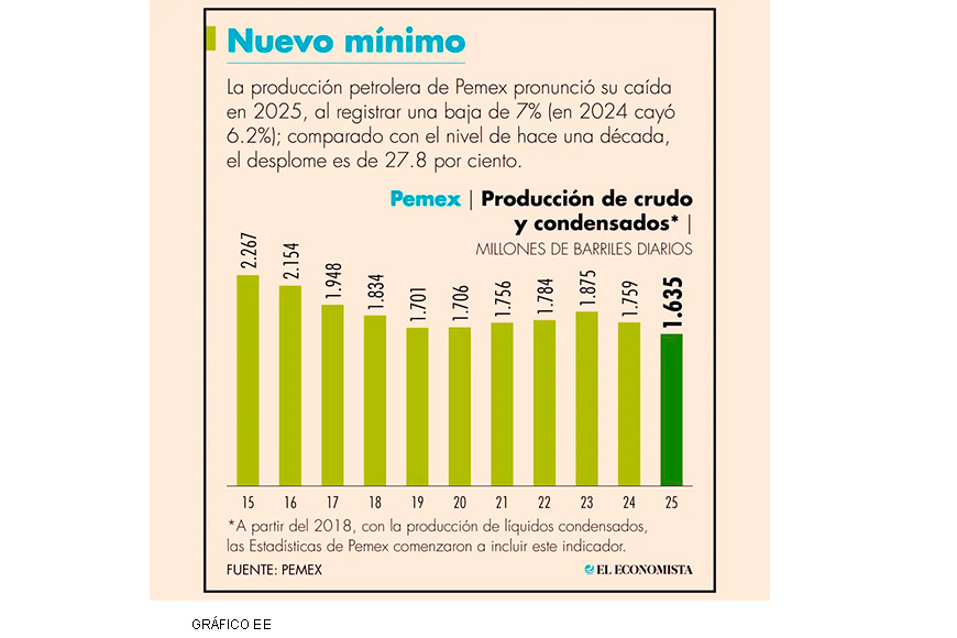 Petróleos Mexicanos (Pemex) cerró el 2025 con una producción de hidrocarburos líquidos (crudo más condensados) de 1.635 millones de barriles diarios, con una caída de 7% en comparación con el reporte del 2024 y llegando al nivel más bajo que se ha reportado en 46 años.