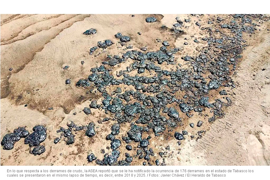En lo que respecta a los derrames de crudo, la ASEA reportó que se le ha notificado la ocurrencia de 176 derrames en el estado de Tabasco los cuales se presentaron en el mismo lapso de tiempo, es decir, entre 2018 y 2025.